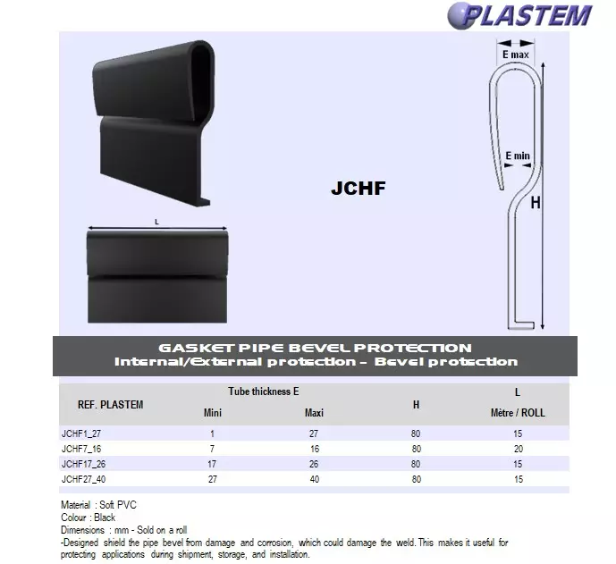 | JCHF17_26 | Gasket pipe bevel protection Thick. 17 to 26mm Black Roll 15m | Prix/pce - Price/pce | 91.4900 | Details |