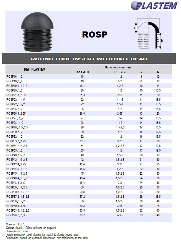 | ROSP19.1_1.2_2 | Round inserts with ball head for tube OD 19,1 mm Wall 1,2-2 - Black | Prix/pce - Price/pce | 0.2590 | Details |