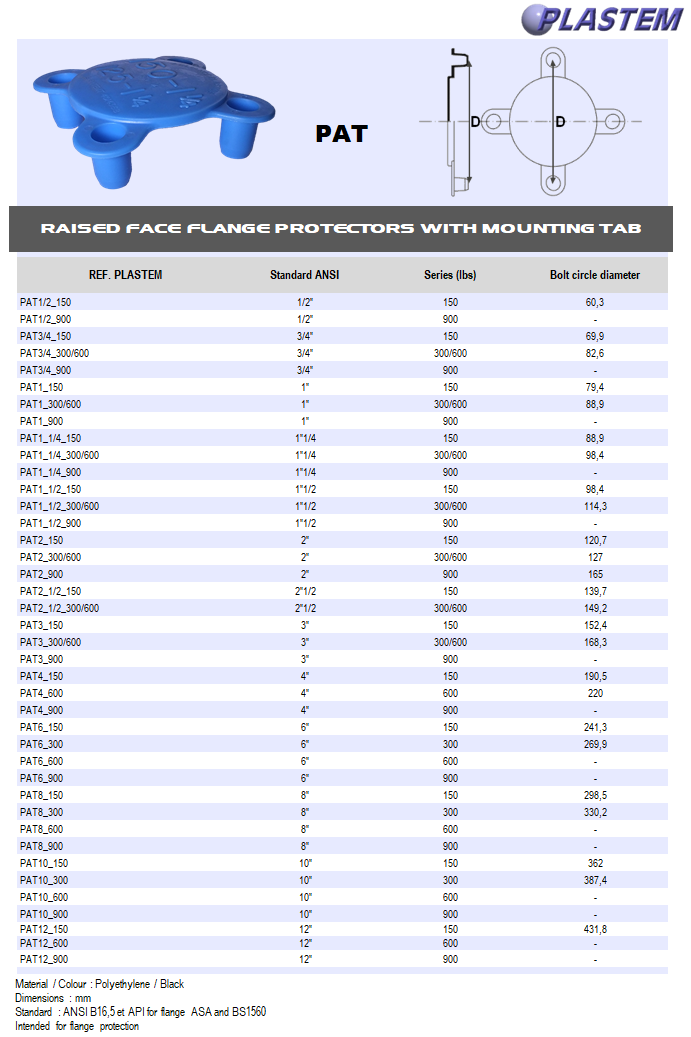 The Raised Face Flange Protectors with mounting tab quickly push-fit into the flange bolt hold. The PE material is weather and petroleum resistant. The Ref. PAT meets ANSI B16.5 and API specifications for ASA and BS1560 flanges.