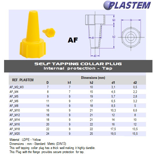 | AF_M4 | Self Tapping Collar Plug M4 - D 8 mm - Yellow | Prix/pce - Price/pce | 0.1664 | Details |
