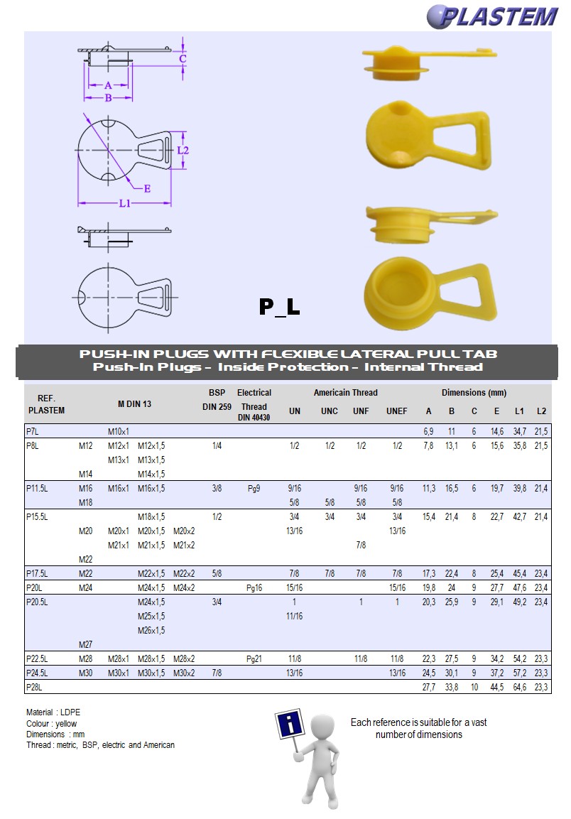 | P7L | Insert plugs OD 11 E 14,6 mm with flexible lateral pull tab | Prix/pce - Price/pce | 0.1944 | Details |