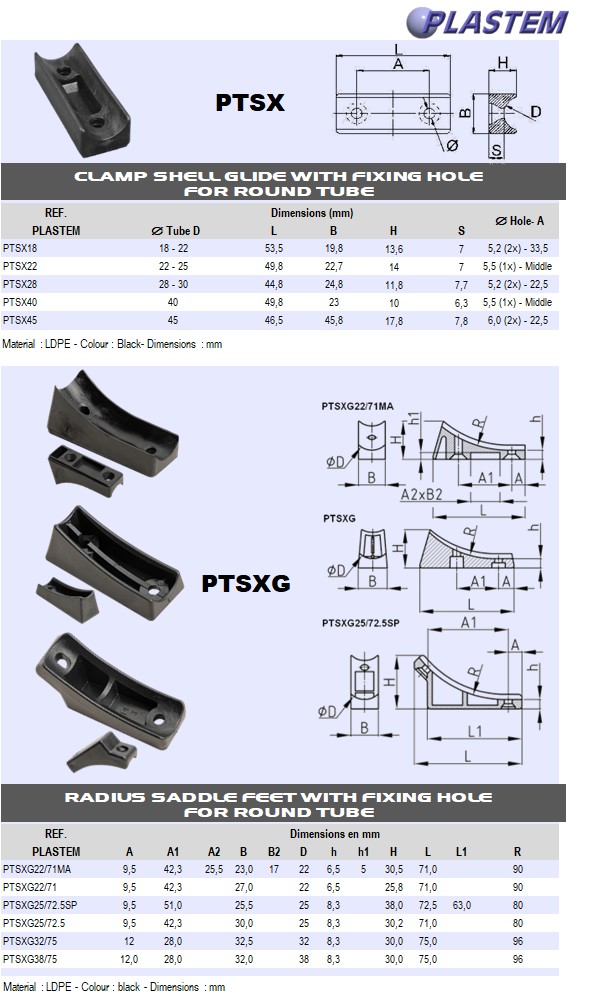 | PTSXG25/72.5SP | Radius saddle feet OD 25 L 72.5 mm 2 Holes hollowed out PE Black | Prix/pce - Price/pce | 0.9594 | Details |