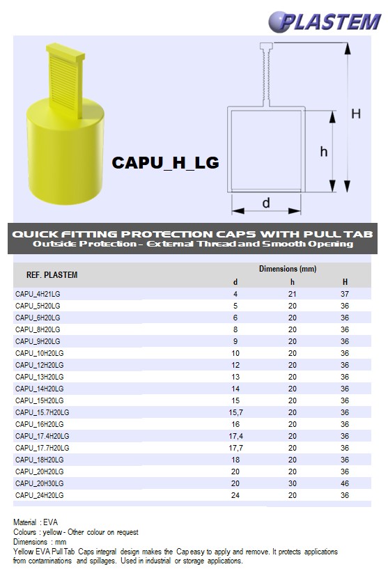 | CAPU_4H21LG | Cap ID 4 h int. 21 mm with pull tab 16 mm - EVA Yellow | Prix/pce - Price/pce | 0.1278 | Details |