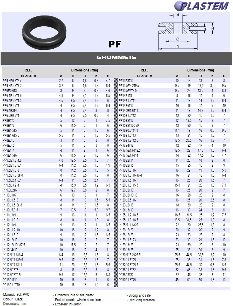 | PF12E2T10C17.5 | Grommet d:10 - D:17,5 - C:12 - h:2 - H:7 mm - PVC Black | Prix/pce - Price/pce | 0.3741 | Details |