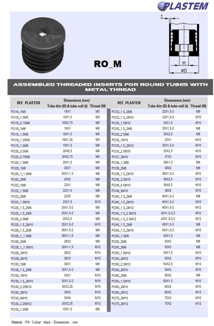 | RO25_1.5_2M10 | Round black inserts tube OD 25 mm Wall 1.5-2 - Metal thread M10 | Prix/pce - Price/pce | 0.5614 | Details |