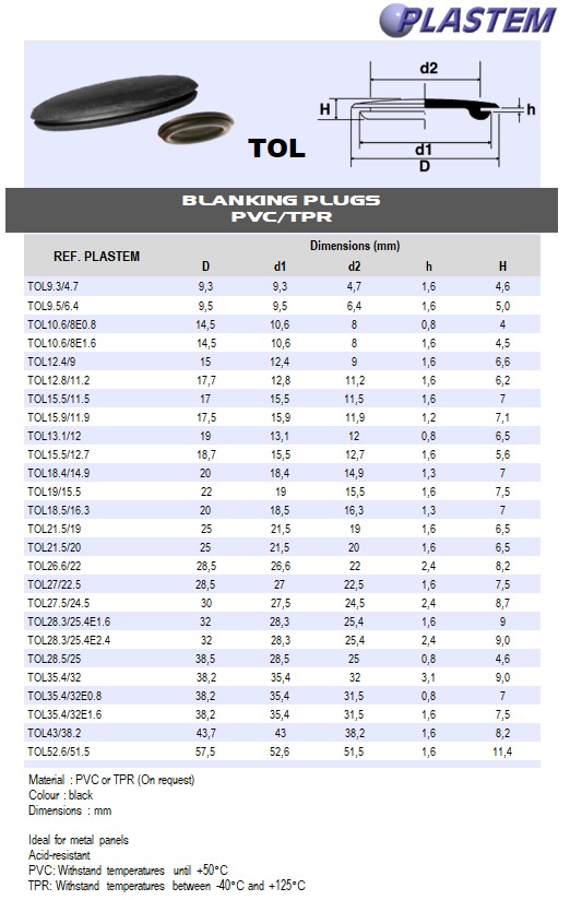 | TOL10.6/8E0.8 | Blanking plug hole ID 10,6 to 8 - Thickness 0,8 mm - PVC black | Prix/pce - Price/pce | 0.0455 | Details |