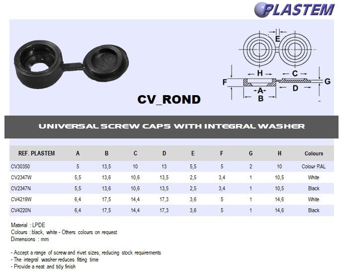 | CV30350 | Screw caps OD 13,5 ID 10 H 5 mm with ring - Black | Prix/pce - Price/pce | 0.0306 | Details |