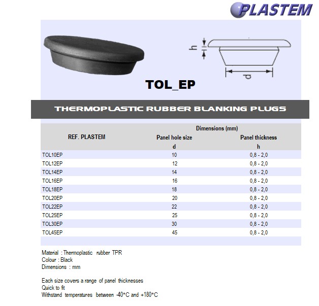 | TOL18EP | Blanking plug hole ID 18 - Thickness 0,8-2,0 mm Soft rubber Black | Prix/pce - Price/pce | 0.4403 | Details |