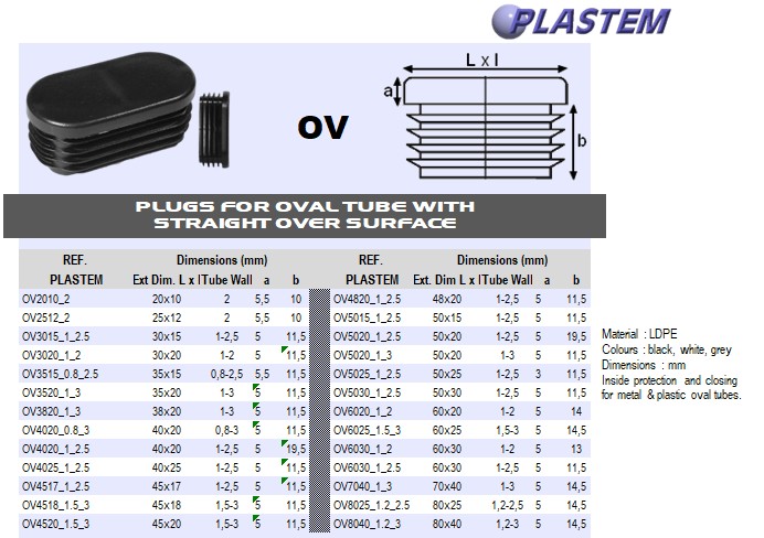OV plastic inserts are intended for inside protection and closing for metal & plastic oval tube.
