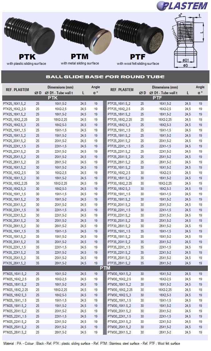 | PTF25_19X1_1.5 | Ball Slider wool base 25 tube OD 19 mm Wall1-1,5 Angle max19° | Prix/pce - Price/pce | 0.7586 | Details |