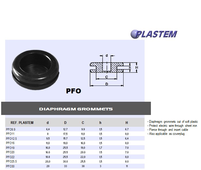 | PFO20 | Diaphragm grommet d:16 - D:25.5 - C:20 - h:1.5 - H:7 mm Black | Prix/pce - Price/pce | 0.7072 | Details |