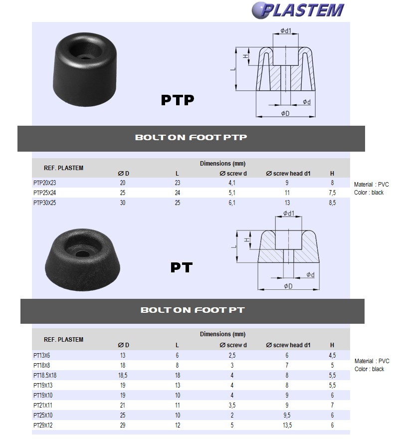 | PT19X13 | Bolt on foot OD 19 Ht. 13 mm Hole 4 mm - PVC Black | Prix/pce - Price/pce | 0.2177 | Details |
