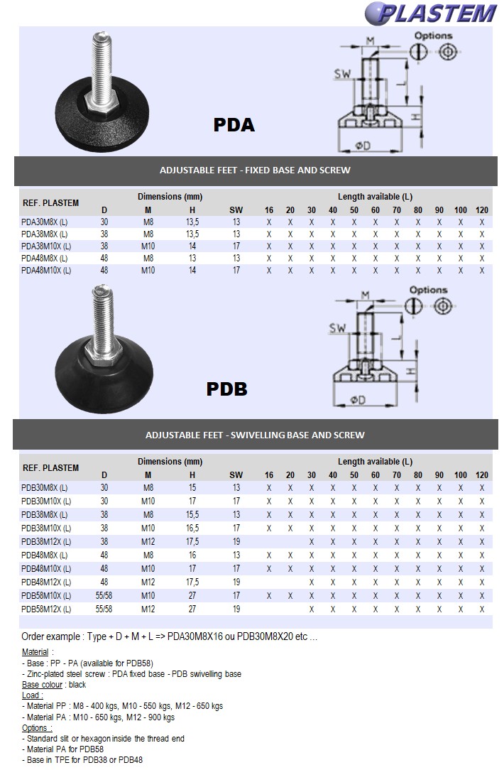 | PDB30M8X70 | Adjustable feet - Swivelling base diam. 30 - Thread M8 x 70 mm | Prix/pce - Price/pce | 0.7824 | Details |