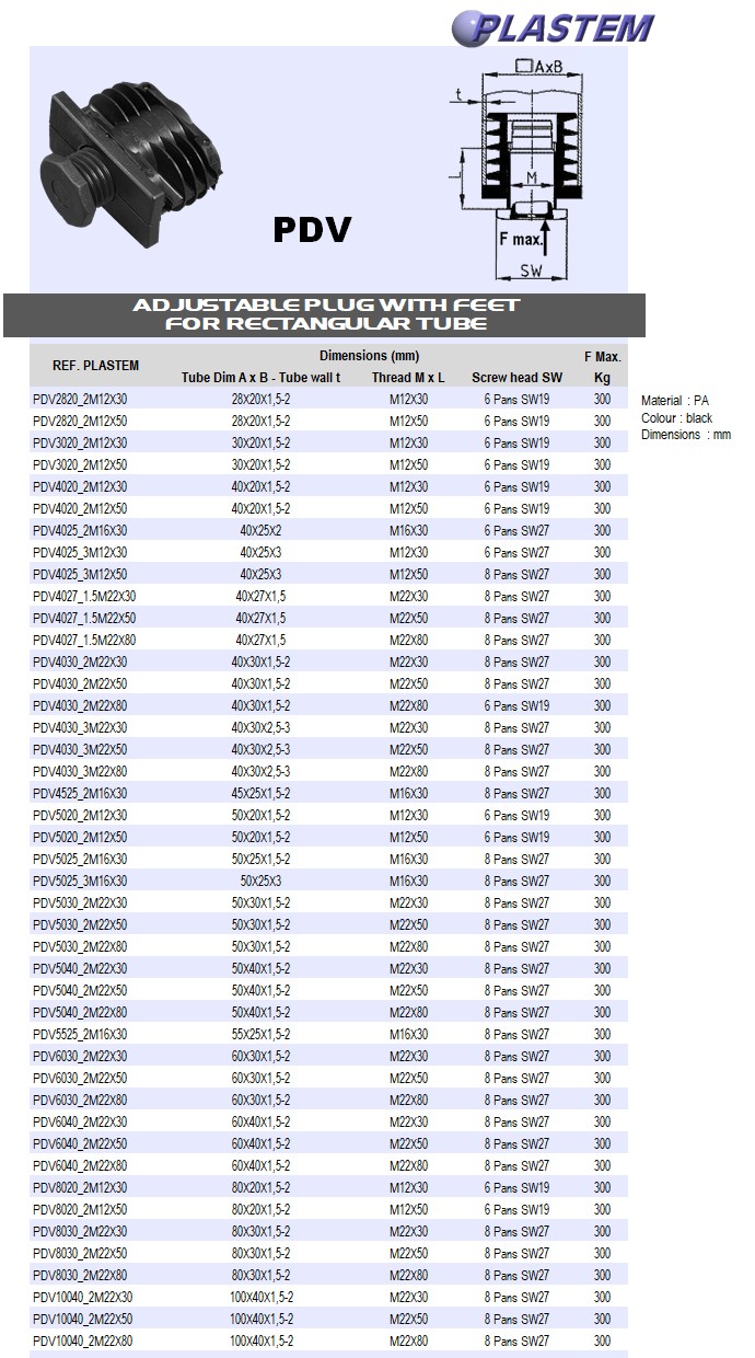 | PDV4025_3M12X30 | Adjustable feet tube OD 40x25 mm Wall 3 - Thread M12 Ht 30 mm | Prix/pce - Price/pce | 1.0348 | Details |