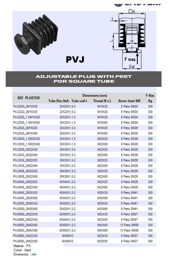 | PVJ3838_2M22X25 | Adjustable feet tube OD 38x38 mm Wall 1,5-2 - Thread M22 Ht 25 mm | Prix/pce - Price/pce | 0.7484 | Details |
