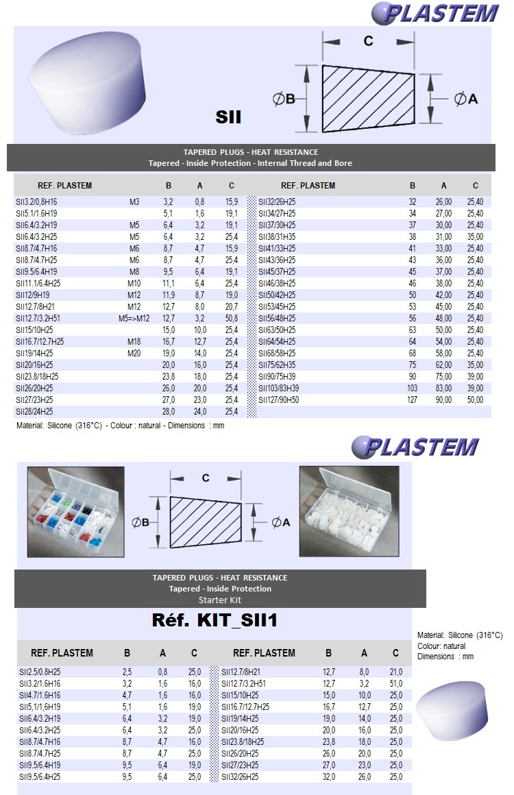 | SII19/14H25 | Tapered caps OD 14,0 to 19,0 Ht. 25,4 mm - Natural silicone | Prix/pce - Price/pce | 0.4753 | Details |