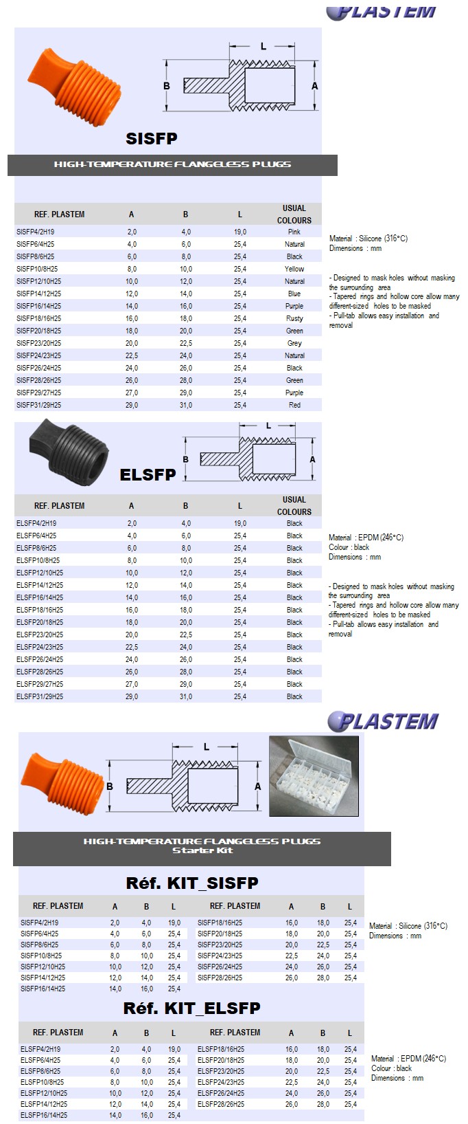 The conical geometry of the plug allows it to adapt to a wide variety of hole diameters, ensuring reliable sealing and precise coverage. Ideal for protecting tapped holes and interior surfaces, it remains perfectly in place during surface treatments, handling or storage.