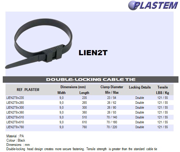 | LIEN2T9X235 | Cable ties with double locking - Width 9 Length 235 mm - PA Black | Prix/pce - Price/pce | 0.3511 | Details |