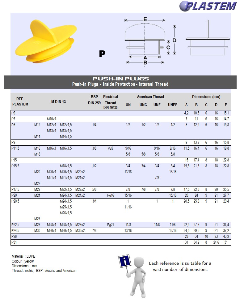 PUSH-IN PLUGS - INSIDE PROTECTION - INTERNAL THREAD