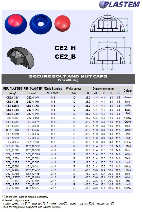 CE2 are ideal for playground equipment and outdoor furniture and intended for hexagon shaped Bolt and nut caps.