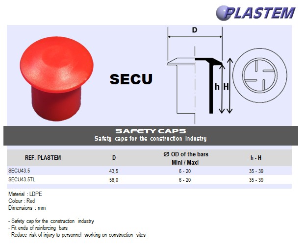| SECU43.5 | safety caps for OD 6 to 20 mm - Head OD 43.5 mm - LDPE Red | Prix/pce - Price/pce | 0.3303 | Details |
