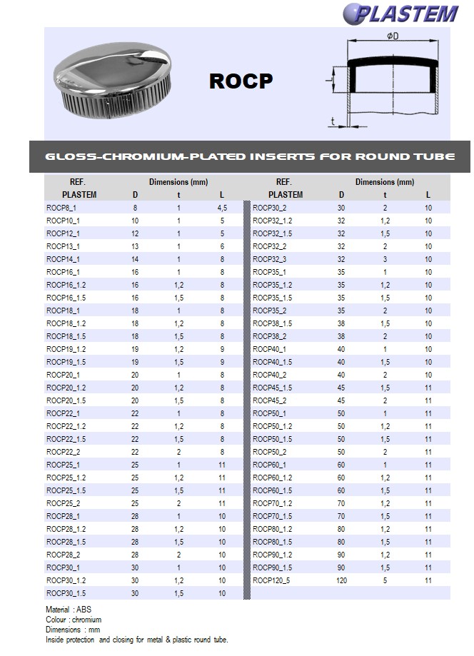 | ROCP22_1.2 | Round inserts for tube OD 22 mm Wall 1,2 - Chromium plated | Prix/pce - Price/pce | 0.5376 | Details |