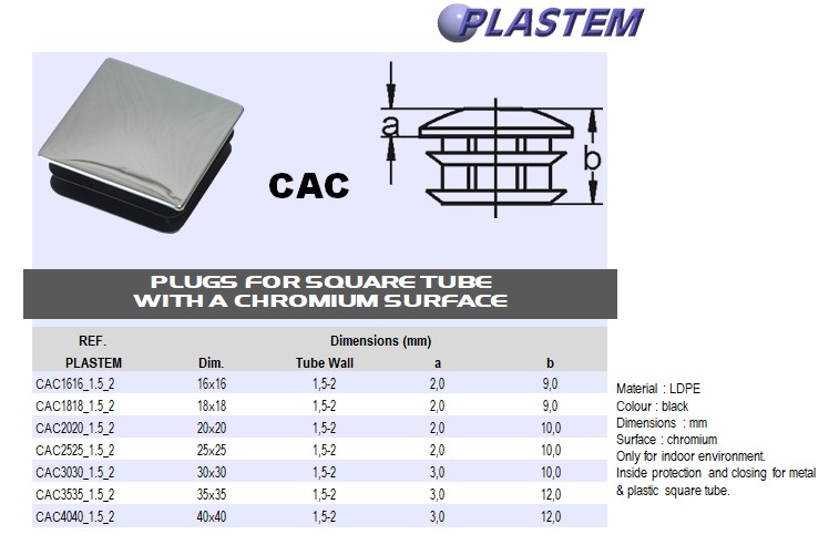 | CAC4040_1.5_2 | Square inserts for tube OD 40x40 mm Wall 1,5-2 - Chromium surface | Prix/pce - Price/pce | 0.6436 | Details |