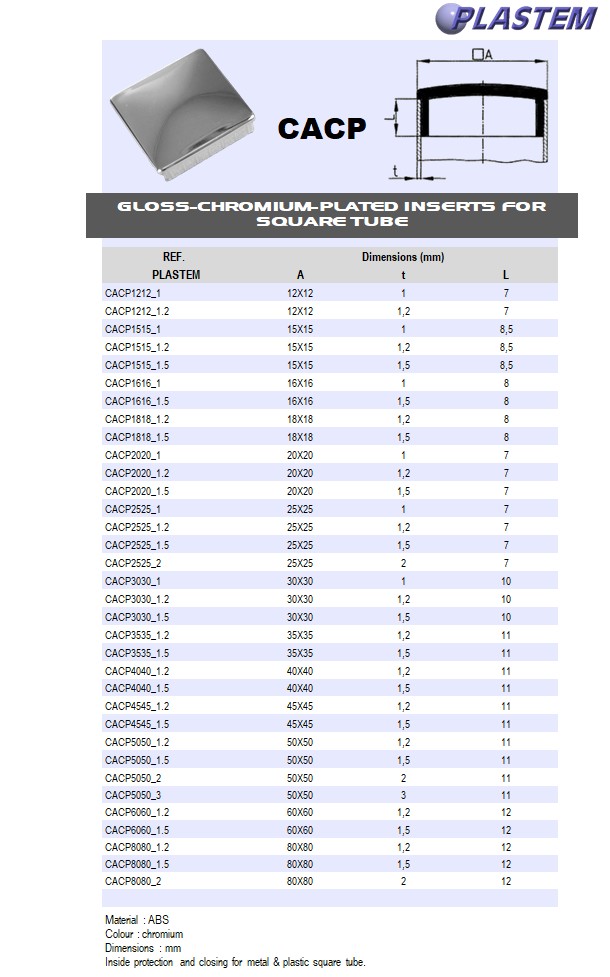 | CACP1515_1.2 | Square inserts for tube OD 15X15 mm Wall 1,2 - Chromium plated | Prix/pce - Price/pce | 0.6002 | Details |
