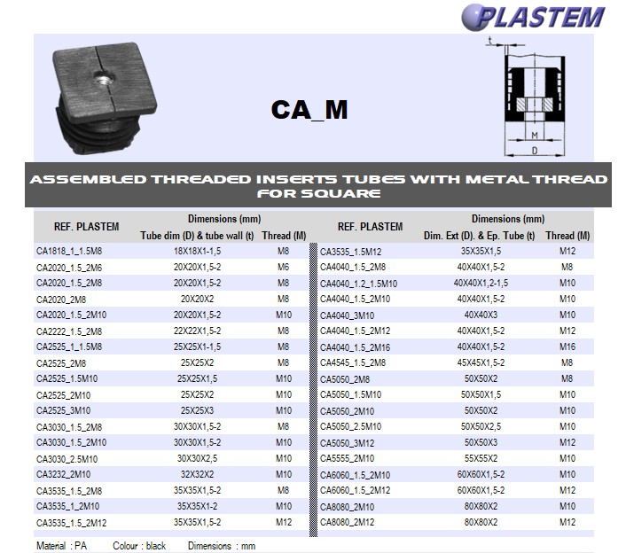 CA3535_1.5M12 Square black inserts tube OD 35x35 mm Wall 1,5 - Metal thread M12 Prix/pce - Price/pce 0.9791 Details