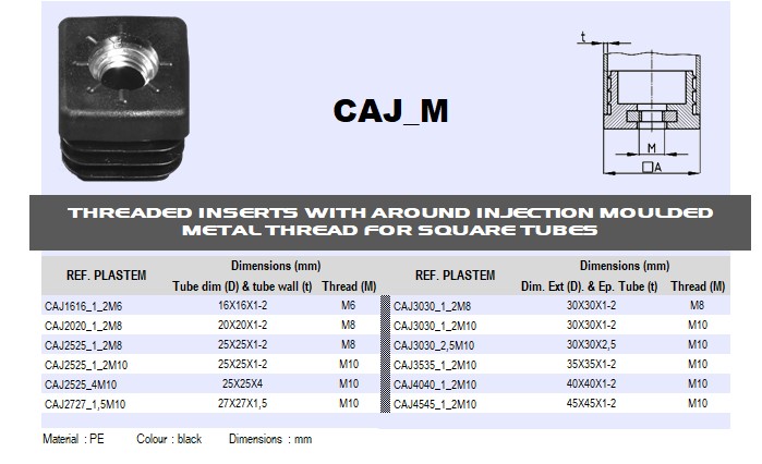 CAJ3535_1_2M10 Square black inserts tube OD 35x35 mm Wall 1-2 - Metal thread M10 Prix/pce - Price/pce 1.0714 Details