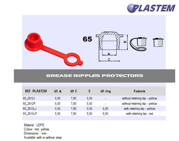 | 65_2913LJ | Grease nipples caps ID 5,5 mm with retaining tap - Yellow | Prix/pce - Price/pce | 0.0427 | Details |