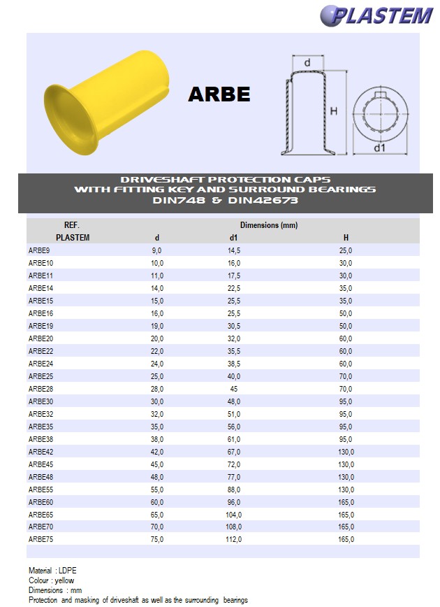 | ARBE60 | Driveshaft fitting key caps ID 60 C 96 Ht. 165 mm - PE Yellow | Prix/pce - Price/pce | 1.4805 | Details |