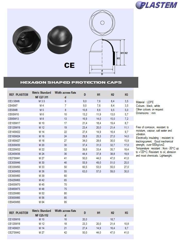 | CE10SW17G | Bolt and nut caps M 10 SW 17 mm - Grey | Prix/pce - Price/pce | 0.1162 | Details |