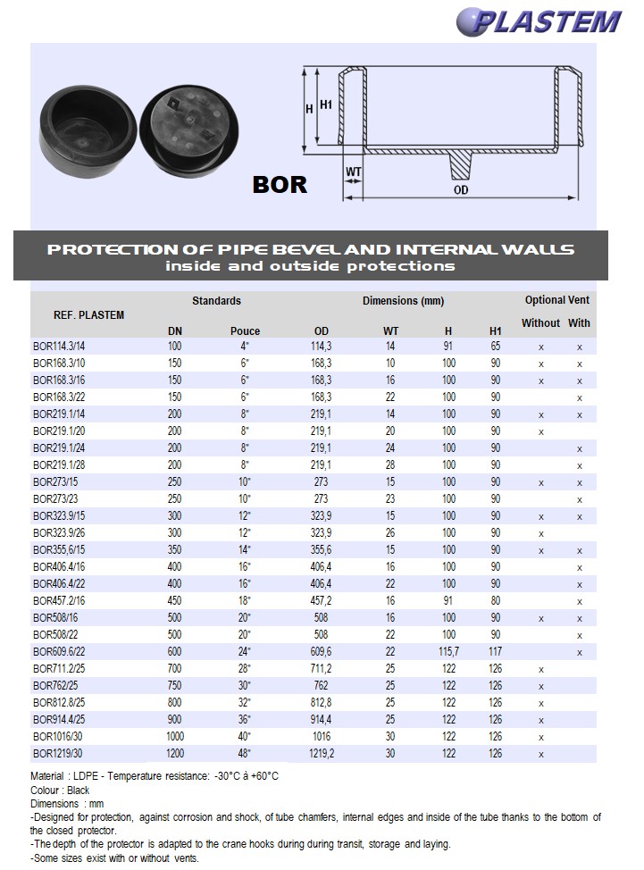 -Designed for protection, against corrosion and shock, of tube chamfers, internal edges and inside of the tube thanks to the bottom of the closed protector.