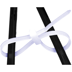 These cable ties allow the tail to pass through twice, creating two loops. This figure of eight assembly allows either double bundling of cables, or to be attached to a fixed position.