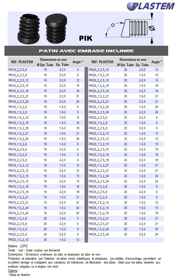 | PIK19_1.5_2_12 | Patin incliné pour tube Ext 19 mm Ep 1,5-2 - angle 12° PE Noir | Prix/pce - Price/pce | 0.2982 | Détails |
