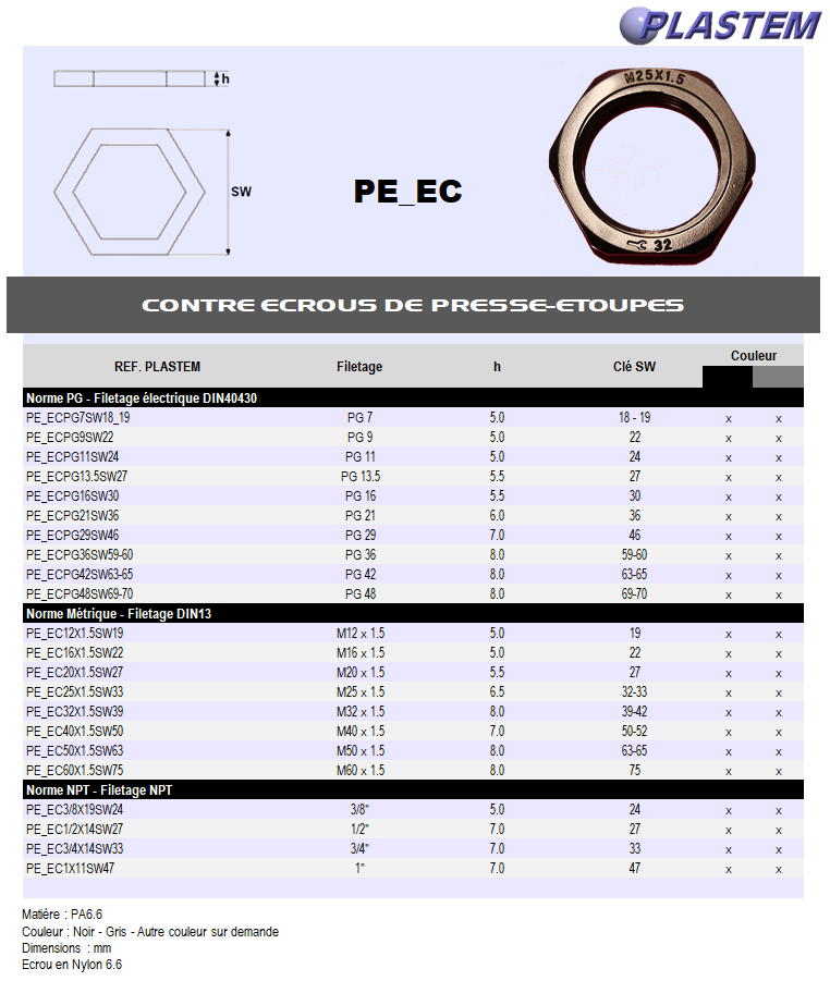 | PE_EC25X1.5SW33G | Contre écrou de presse-étoupes M25x1.5 Ht 6,5 mm Clé 33 mm PA Gris | Prix/pce - Price/pce | 0.7767 | Détails |