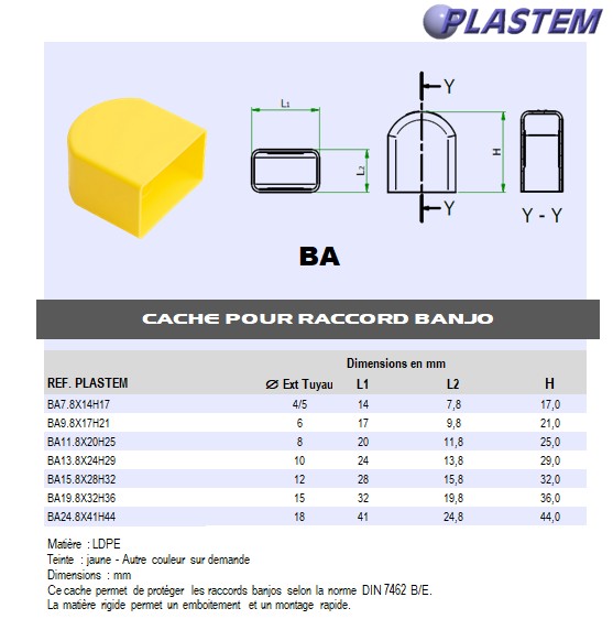 | BA13.8X24H29 | Cache raccord banjo de tuyau ext 10 Dim int. 13,8x24 Ht. 29 mm - Jaune | Prix/pce - Price/pce | 0.0717 | Détails |