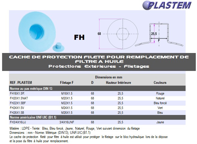 | FH22X1.5BF | Cache pour remplacer filtre à huile - Filetage M22x1,5 - Bleu Foncé | Prix/pce - Price/pce | 0.7278 | Détails |