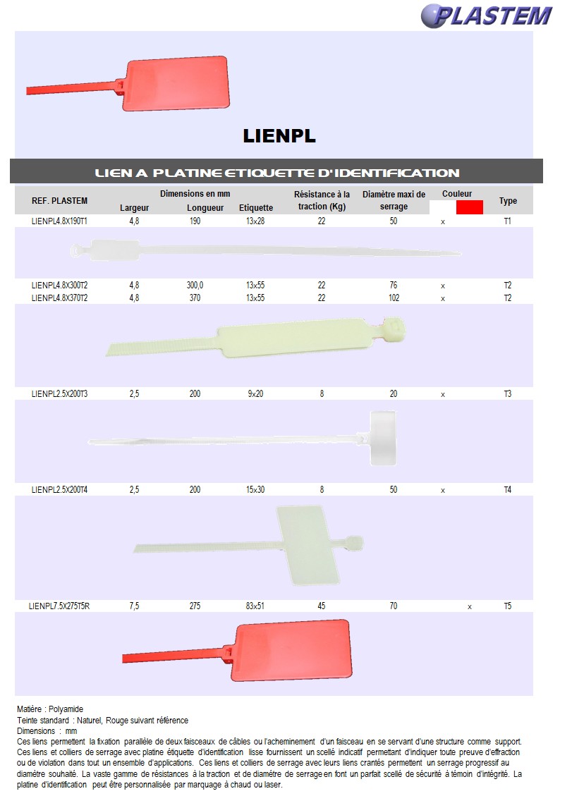 | LIENPL7.5X275T5R | Liens 7,5x275 étiquette identification 83x51 mm Type T5 - PA Rouge | Prix/pce - Price/pce | 0.5324 | Détails |