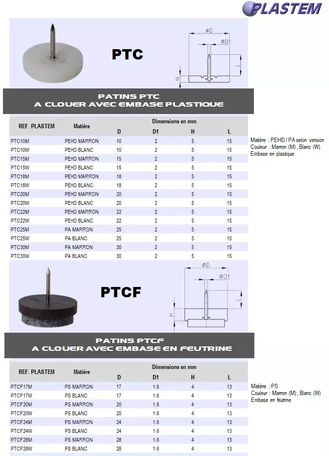 | PTC25W | Patin à clouer diam. 25 Ht. 5 - Clou diam. 2 Ht. 15 mm - PA Blanc | Prix/pce - Price/pce | 0.3740 | Détails |