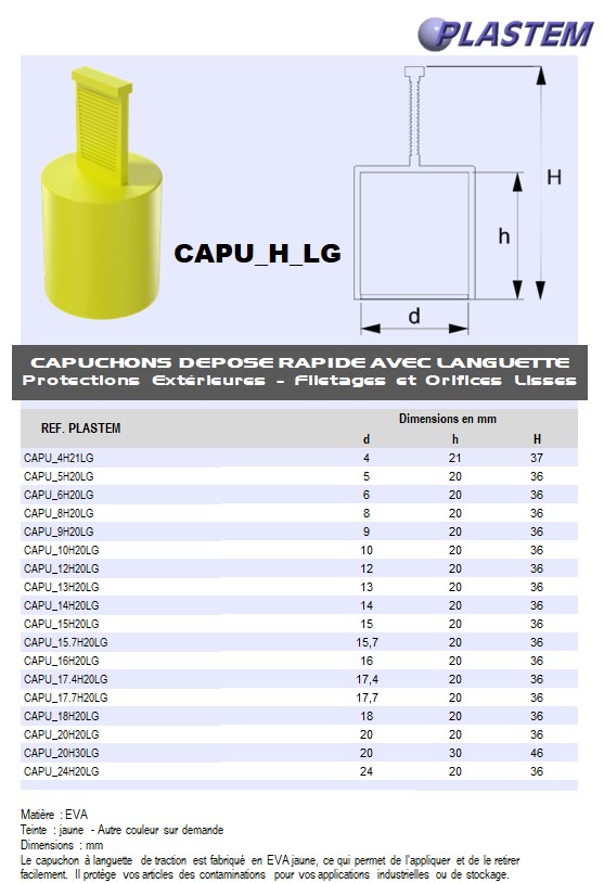 CAPU_12H20LG Capuchons Diam int. 12 h int. 20 mm à languette 16 mm - EVA jaune Prix/pce - Price/pce 0.1492 Détails