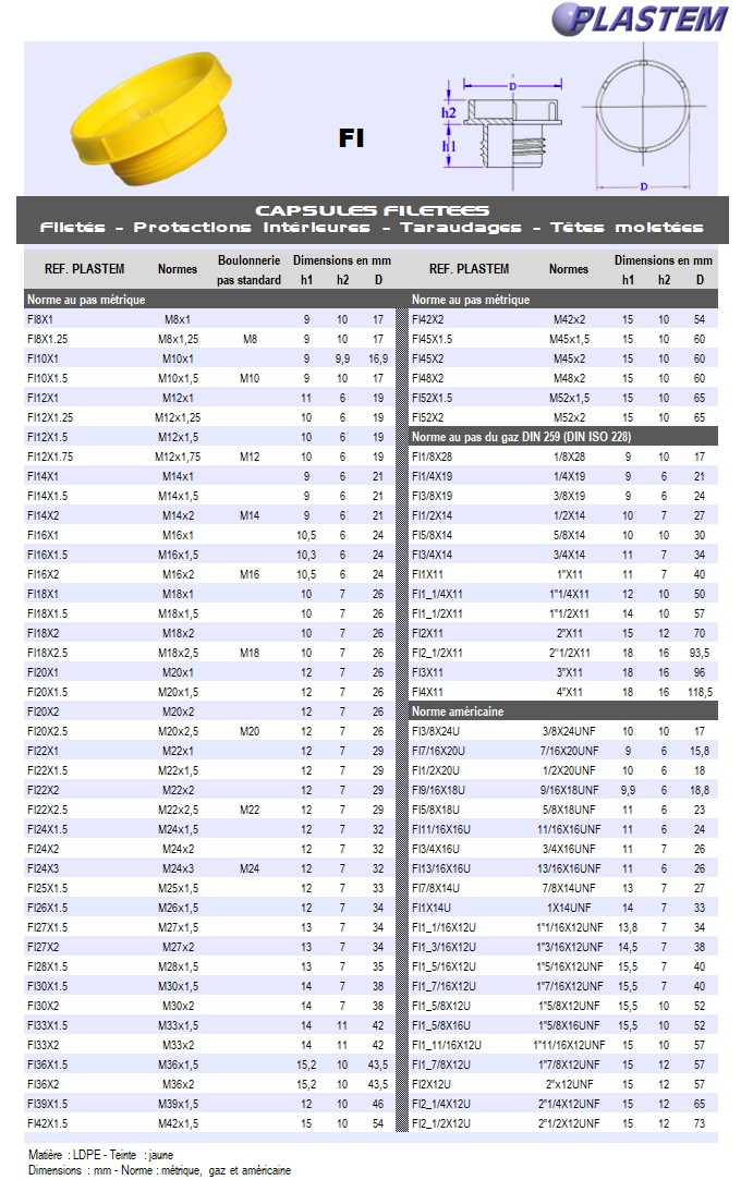 | FI18X1.5 | Bouchons filetés M18x1,5 - Jaune | Prix/pce - Price/pce | 0.1903 | Détails |