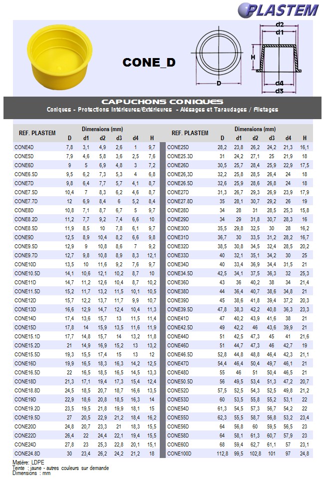 | CONE15.2D | Caps coniques Diam ext. 14,9 à 16,9 mm Col 21 mm - Jaune | Prix/pce - Price/pce | 0.1861 | Détails |