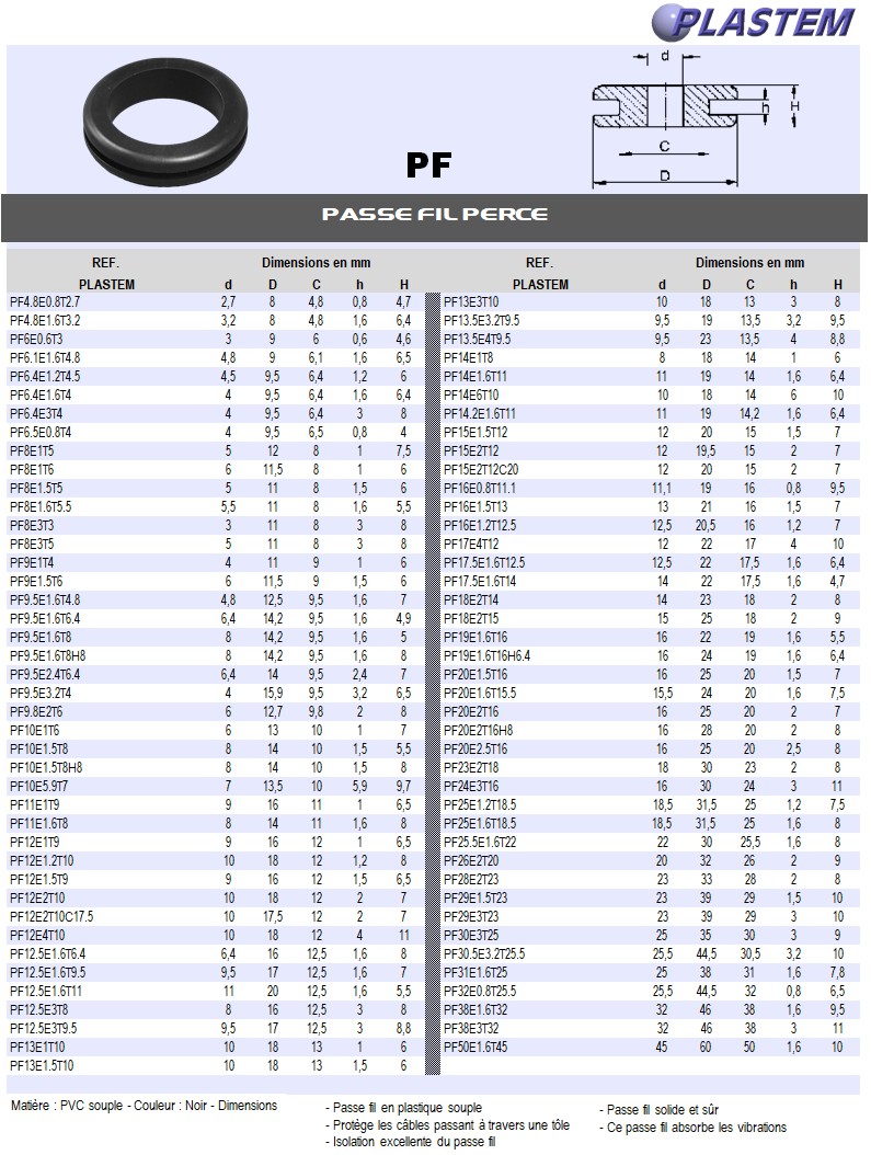 | PF13E1T10 | Passe-fil d:10 - D:18 - C:13 - h:1 - H:6 mm - PVC Noir | Prix/pce - Price/pce | 0.3069 | Détails |