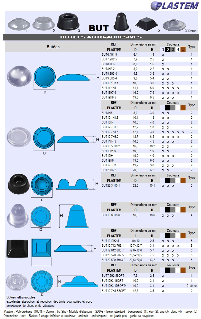 Plastem vous propose un large choix de butées adhésives plastique pour répondre à l'ensemble de vos besoins. Leur composition en Polyuréthane à 100% garantit une élasticité et une dureté de qualité pour une utilisation optimale.