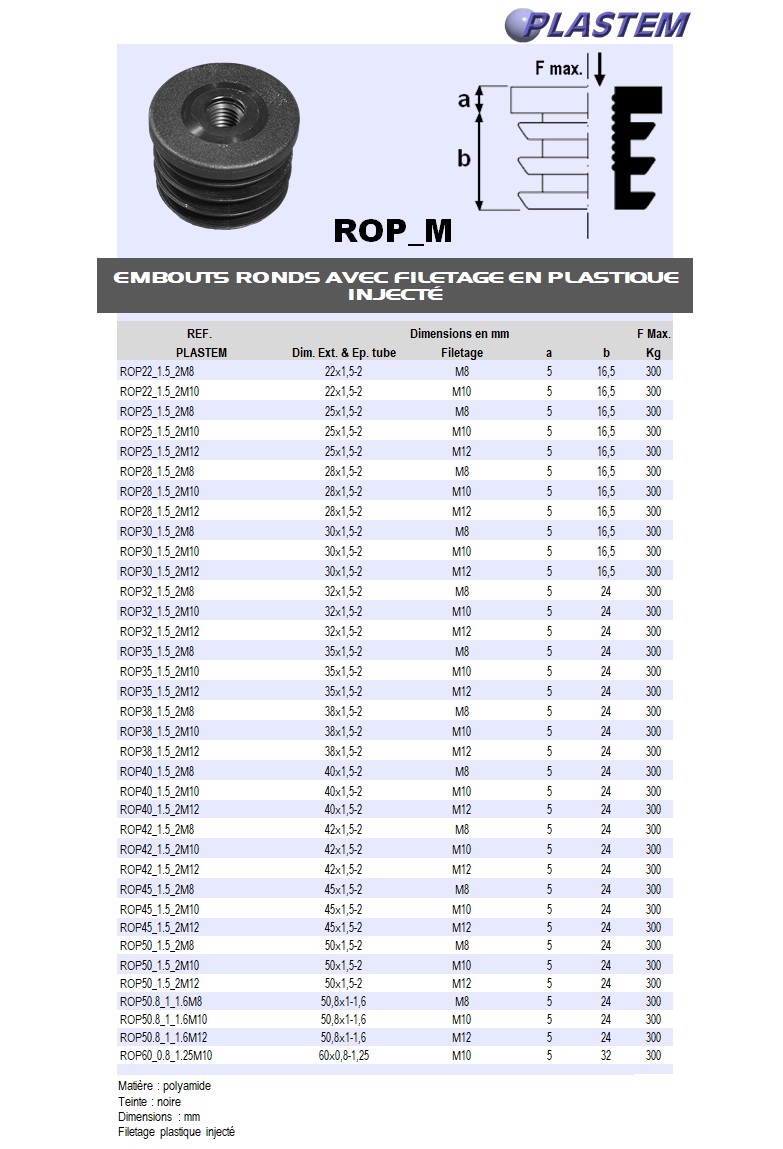 | ROP28_1.5_2M12 | Embouts ronds noirs tube Ext. 28 mm Ep. 1,5-2 filetés M12 | Prix/pce - Price/pce | 0.4526 | Détails |