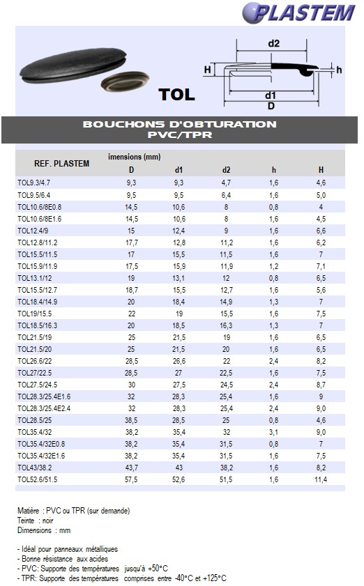 | TOL19/15.5 | Cache tôle trou diam 19 à 15,5 - Epaisseur 1,6 mm - PVC noir | Prix/pce - Price/pce | 0.0661 | Détails |