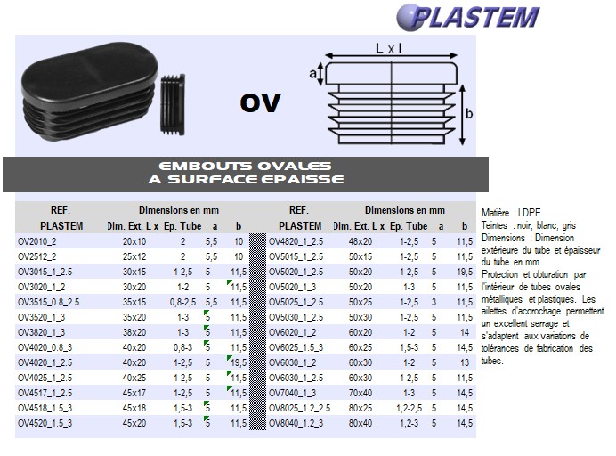 | OV4020_1_2.5G | Embouts ovales pour tube Ext. 40x20 mm Ep. 1-2,5 - Gris | Prix/pce - Price/pce | 0.1540 | Détails |