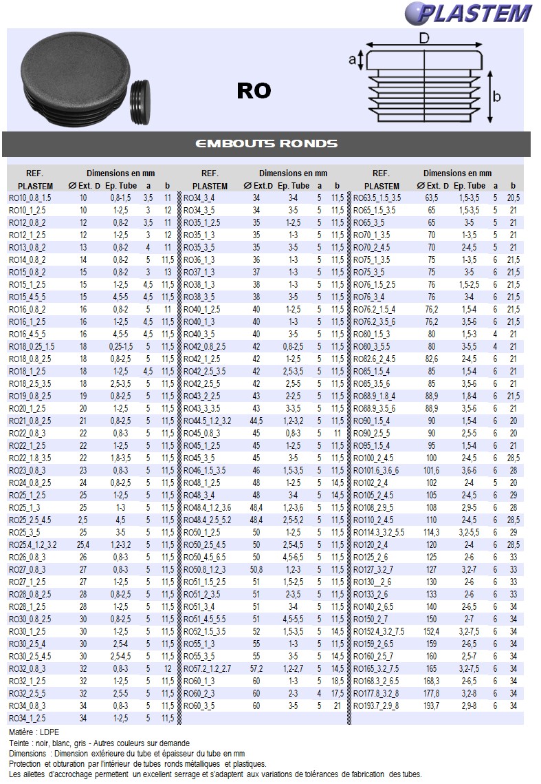 Ce bouchon plastique embout rond est destiné à la protection et à l'obturation par l'intérieur de tubes ronds métalliques et plastiques. Les ailettes d'accrochage de ce bouchon embouts ailettes ronds permettent un excellent serrage et s'adaptent aux variations de tolérances de fabrication des tubes.